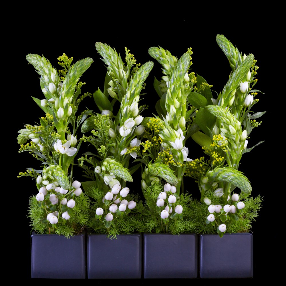 Four pots in one with ornithogalum, solidago, asparagus & hypericum.